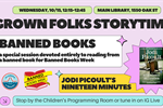 Grown Folks Storytime: Banned Books Week 15 Oct 2025 Bring your lunch to the Children's Programming Room of the Main Library on Wednesday afternoons for a half-hour of short stories, picture books, and other tales curated by our expert librarians. This month, a special reading from a banned book: Jodi Picoult's Nineteen Minutes. Main Library | Children's Programming Room, 1550 Oak Street | Alameda, CA, Main Library 94501 Tagged as: , Adult, Main Library, Community