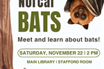 NorCal Bats @ Main Library 22 Nov 2025 Meet and learn about bats on Saturday, November 22nd at 2pm. Plus! Join us after for fun bat themed crafts! Alameda Free Library, 1550 Oak St., Main Library 94501 Tagged as: , Arts & Crafts, Kids & family, Main Library, Youth events, Crafts, Talks & workshops, Science/Tech, DIY, Children, Family